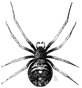 Varied and well-known animals, each with four pairs of walking legs and a body divided into a cephalothorax (which combines the head and thorax) and abdomen. The spiders present a tremendous variety of shapes, some being round and fat, like the black widow, Latrodectus mactans (Fabricius), fig. 73, others being long and slender, mimicking ants. Others are crablike in shape; some that are long and slender are extremely rapid in their movements. Spiders appear practically everywhere. Certain species are domestic and are found only in houses. In Illinois the only poisonous species of any importance are the black widow spider, which is found in a variety of situations, and the recluse spider, Loxosceles reclusa Gertsch & Mulaik, which has been found in house basements in southern Illinois.