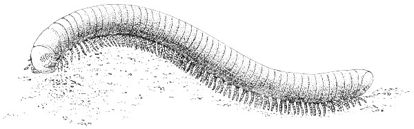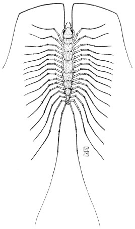 Elongate animals, similar in general appearance to the millipedes but with only one pair of legs on each body segment. Many species are predacious, feeding on insects and other small animals in rotten logs and humus. Most familiar to the city dweller is the house centipede, Scutigera forceps Rafinesque, fig. 76; this is a common inhabitant of dark places in houses, where it runs about with incredible speed in search of the small insects upon which it feeds. Other species may be encountered under boards and stones in gardens, fig. 77. Some Illinois centipedes found in woody or rocky situations are 2 inches or more long. No chilopod group in this state is dangerous to human beings, but to the south occur centipedes nearly a foot long that may inflict serious bites.