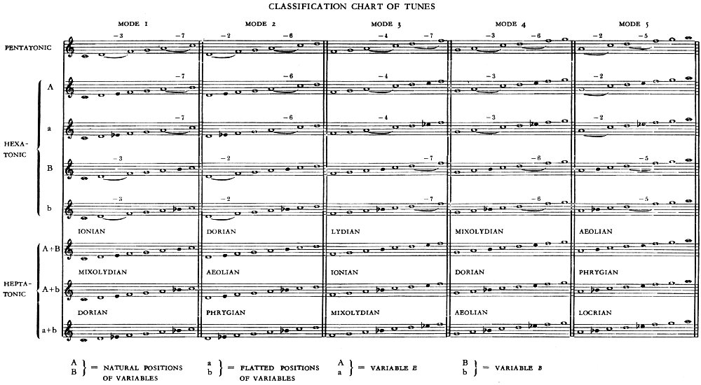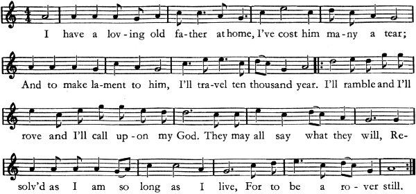 The mountain songs designation is one of the least appropriate. Its only justification lies in the fact that some types of traditional song, the secular ballads among them, have persisted perhaps in larger numbers in mountainous regions like those of the southern Appalachians and the Ozarks and are more widely sung there than elsewhere. These songs were Irish, Scotch, and English across the water. They came from highlands and lowlands. They were the common possession of early Americans of those ethnic stocks,—those people who never left the tidewater parts, those who came into the highlands and settled there, and those greater numbers who trekked through the mountain gaps, down the western slopes and spread into the rolling country and plains. The present collection is of songs sung by all these people in all of these parts in early and more recent times and now. Hence, to call them “mountain songs” would be quite inadequate and misleading.[1]
