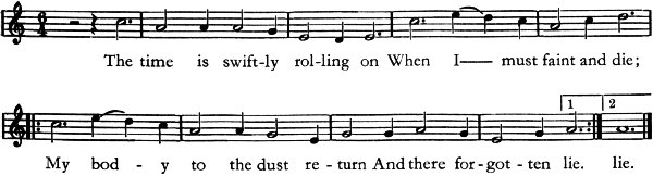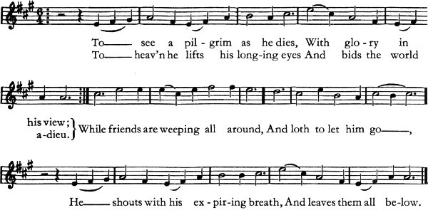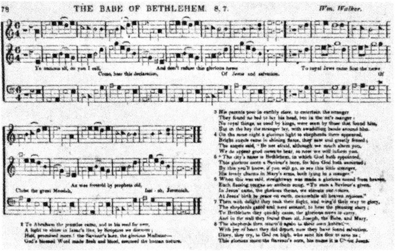 A similar book appeared in 1642, called: Psalms, or Songs of Zion, turned into the language and set to the tunes of a strange land, by William Slatyer, intended for Christmas Carols and fitted to divers of the most noted and common but solemn tunes, everywhere in this land familiarly used and known. That the Puritans of that century did not invariably confine themselves to “solemn tunes” is indicated by Shakespeare when the Clown in The Winter’s Tale, in praising the vocal prowess of the shearers, assembled for the sheep-shearing feast, says: “Three-man song-men, all, and very ix good ones...; but one Puritan amongst them, and he sings Psalms to hornepipes.” In the New Variorium Shakespeare, H. H. Furness, in commenting on the passage, says: “He sings Psalms to the lively tunes to which horn-pipes were danced,—a practice which, we know was extremely popular in France, and from allusions like the present we can infer that it was not unknown in England.”