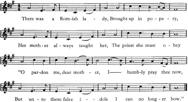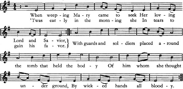 The religious ballads by and large are folk-produced beyond any reasonable doubt. They are uniformly songs for individual singing, not for groups. The sung story was the thing. In one ballad it would be the story of some bad woman, Wicked Polly for example, “who died in sin and deep despair” and went to hell; in another, of some good woman, the Romish Lady for instance, who was burned at the stake for espousing the Protestant cause. Much ballad material was furnished also by the Bible. Scriptural events like the curing of the man sick with the palsy, the restoring of sight to blind Bartimeus, Daniel’s experience in the lions’ den, the raising of Lazarus, the baby Moses in the rushes, the Prodigal Son parable, the birth of Christ, His crucifixion and death,—all are retold in the ballads.