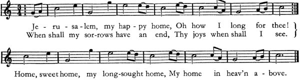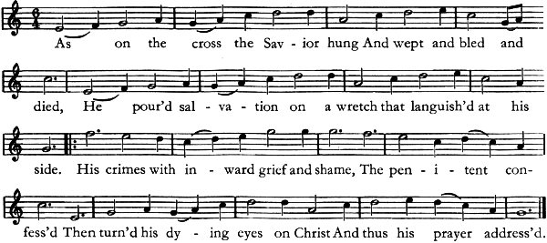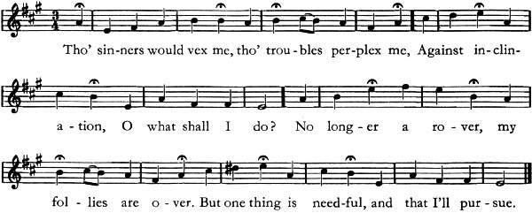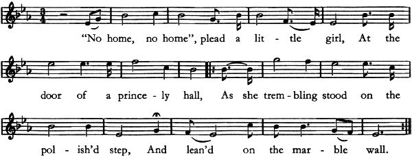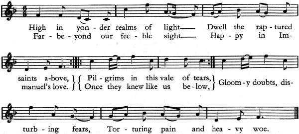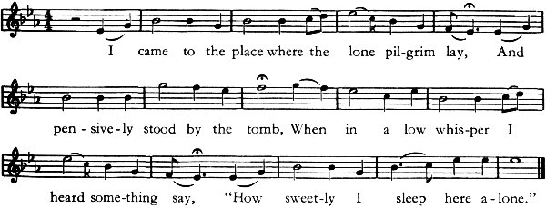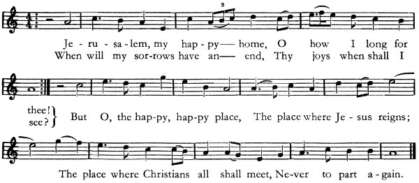 In the seventeenth and eighteenth centuries the Puritan congregations of New England are said to have had music committees one of the chief duties of which was to go among the folk and gather attractive melodies to be used as hymns. And this was also the custom of the Primitive Methodists, both in Great Britain and in America. In writing of this usage at a later date, Chappell says: “The Primitive Methodists ... acting upon the principle of ‘Why should the devil have all the pretty tunes?’ collect the airs which are sung at pot and public houses, and write their hymns to them ... in this sect we have living examples of the ‘puritans who sing psalms to horn-pipes,’ They do not mince the matter by turning them into slow tunes, ... but sing them in their original lively time.”