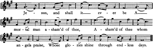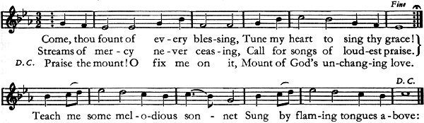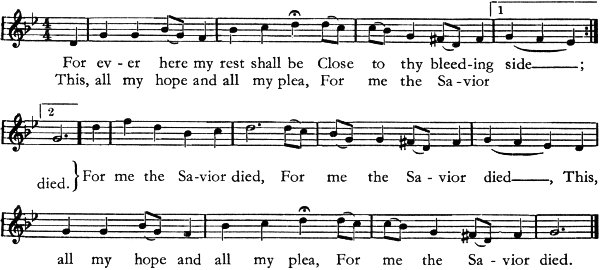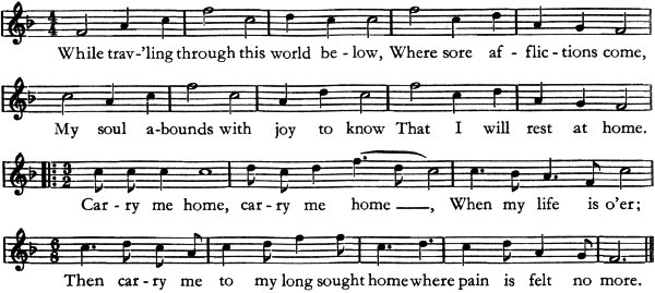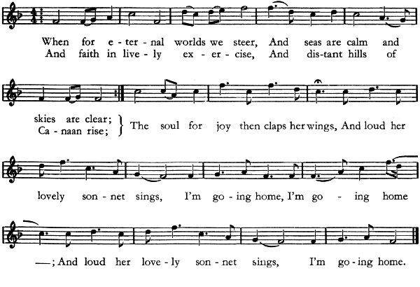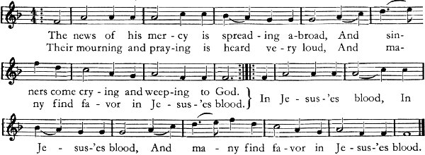 With the spread of this movement to America a fertile soil for its further development seems to have been found. Here it became known as the Great Southern and Western Revival. Here its store of songs, made after the pattern used in England, was greatly enlarged. In fact the masses took the matter of what they were to sing so completely into their own hands that the denominational authorities, especially the Methodists, though they tried to control it, became helpless.[2]