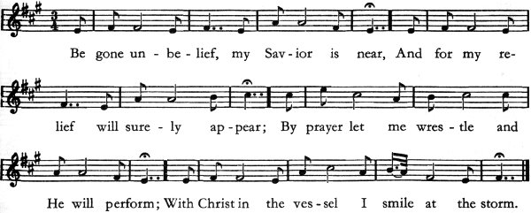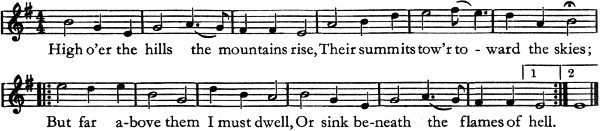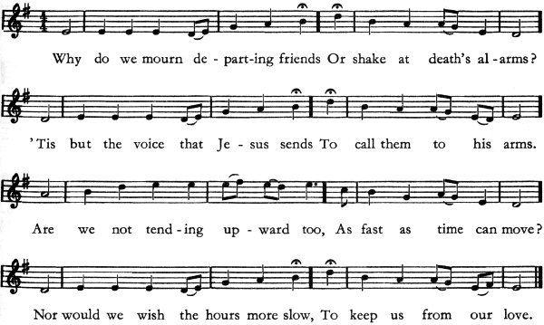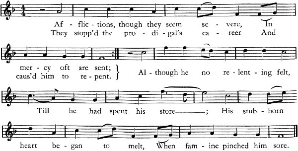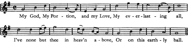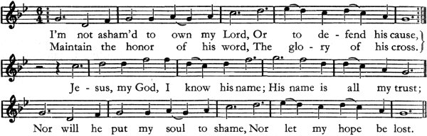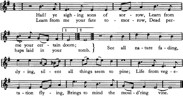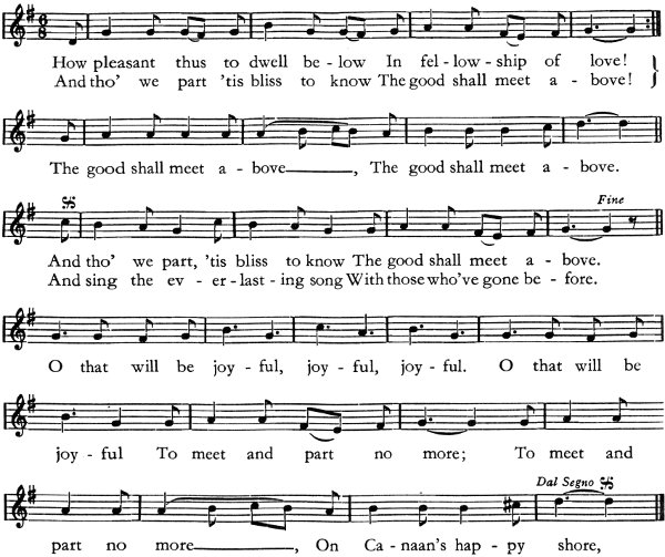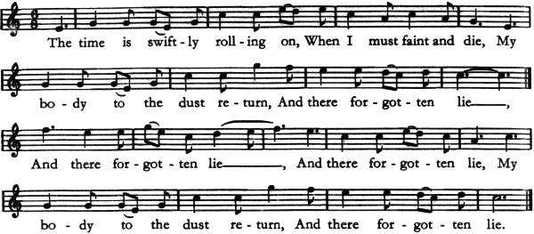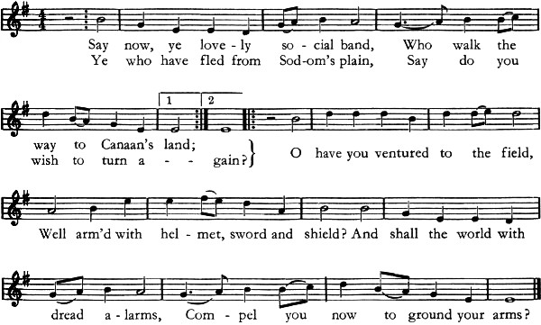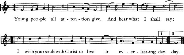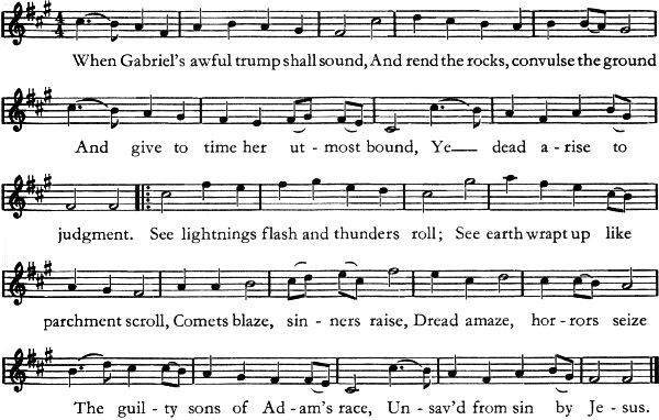 In looking through the folk-hymns in the second part of this collection one will see scores of tunes which are clearly recognizable as those still sung to ‘Barbara Allen’, ‘Lord Lovel’ and other ancient ballads. This is adequate evidence, I assume, as to where the folk sought and found its hymn tunes. The extent of this tune borrowing process is indicated on page 18f of this Introduction. The texts, on the other hand, may be from the pen of Watts or other eighteenth century English religious poets, or they may be the humbler creations of rural American religious verse makers, like John Adam Granade, or John Leland.