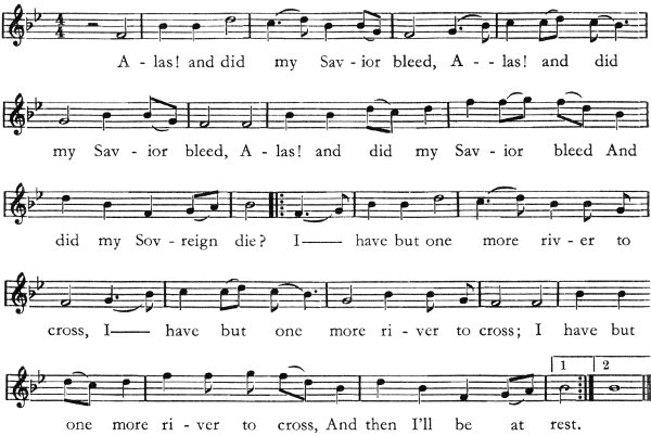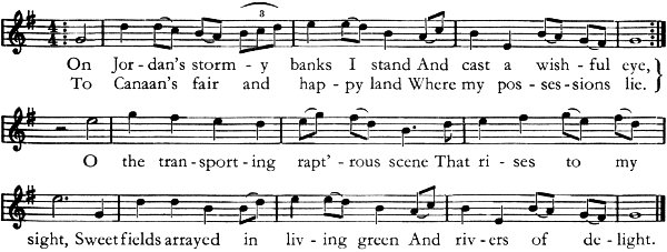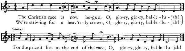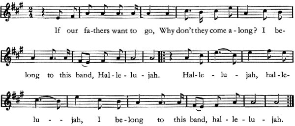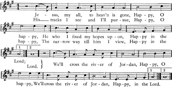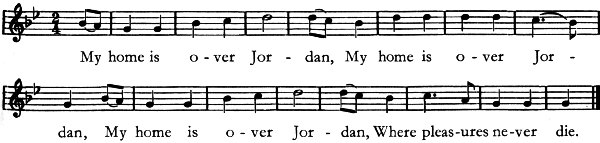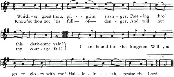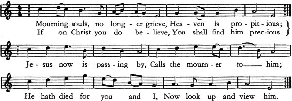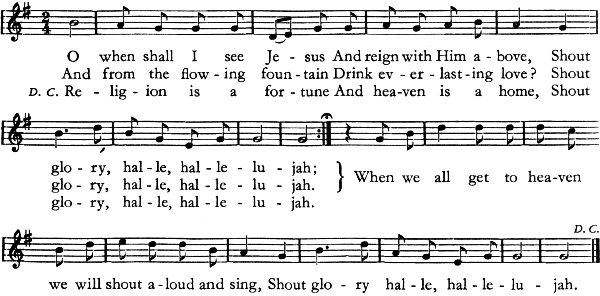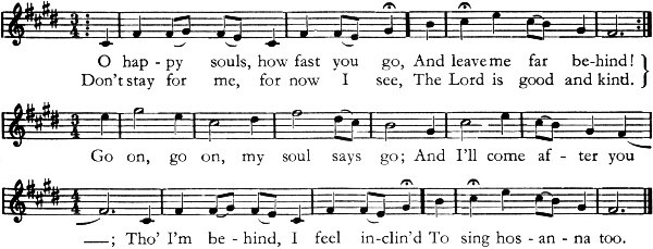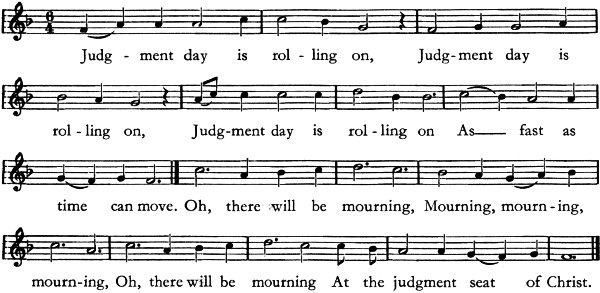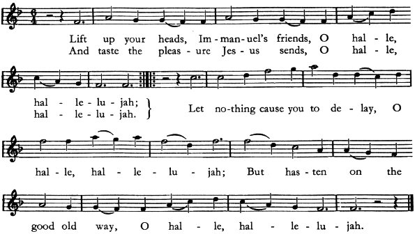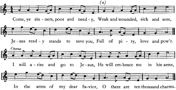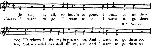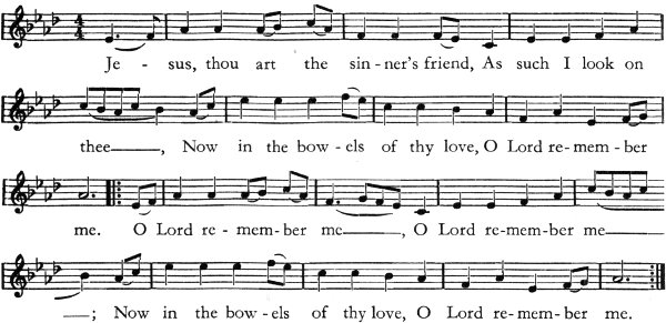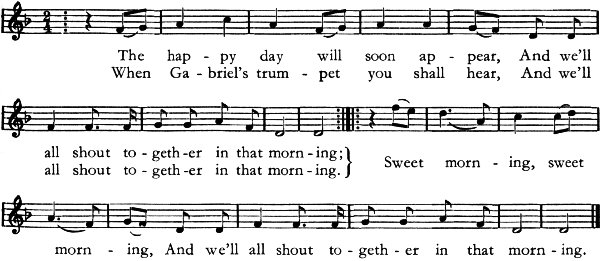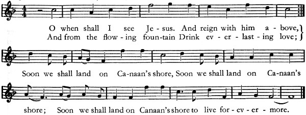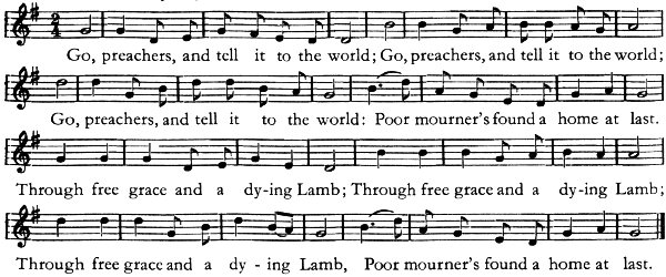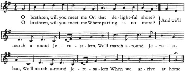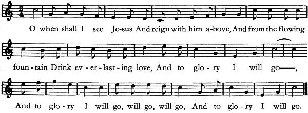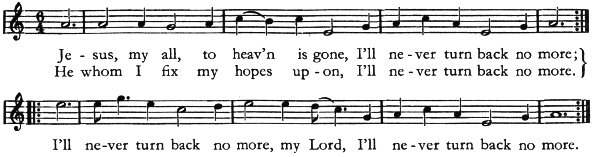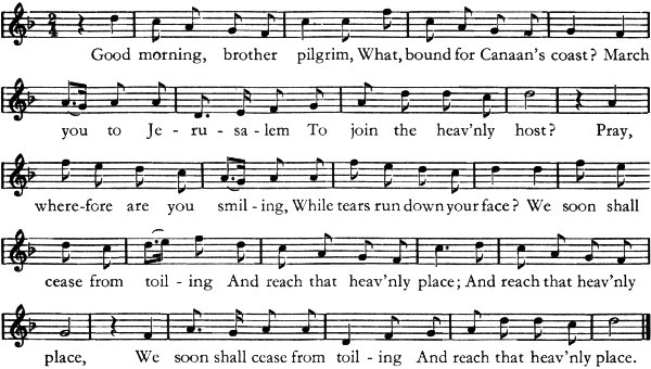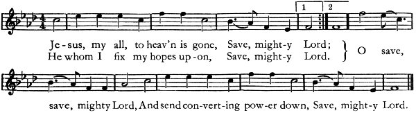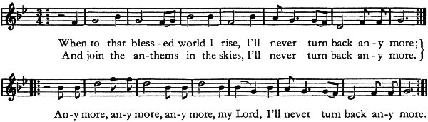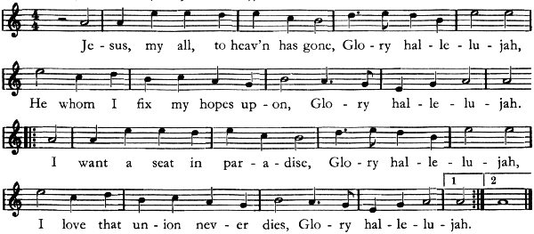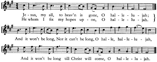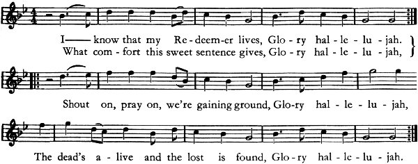 Bearing all this in mind it is perhaps easier to understand how the folk-hymns—grown up in a less boisterous environment—failed to satisfy the new conditions. At the camp meetings it was not a question of inducing every one to sing, but of letting every one sing, of letting them sing songs which were so simple that they became not a hindrance to general participation but an irresistible temptation to join in. The tunes of the folk-hymns were adequate. But the texts (Watts, Wesley and their schools) still demanded a certain exercise of learning and remembering which excluded many from the singing. The corrective lay in the progressive simplification of the texts; and it was in the main this text simplification which brought about and characterised the type of camp-meeting song which was called, in contradistinction to all other types, the spiritual song.