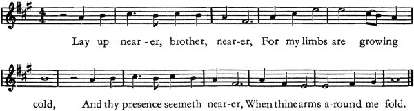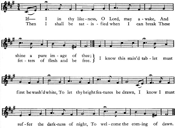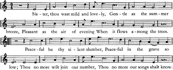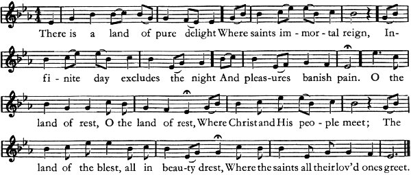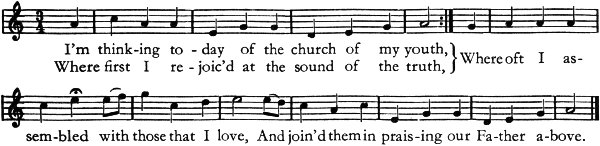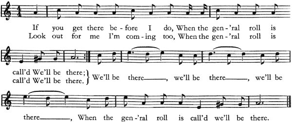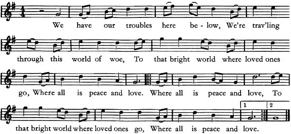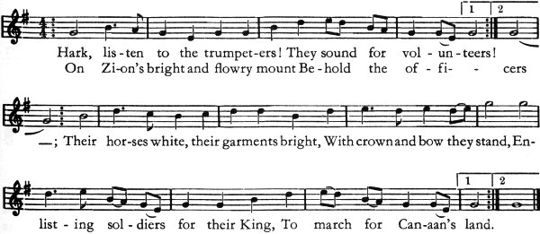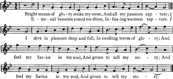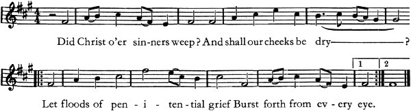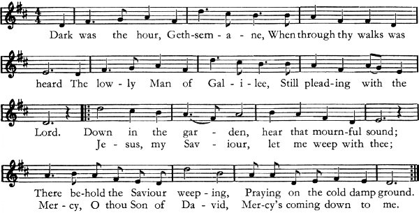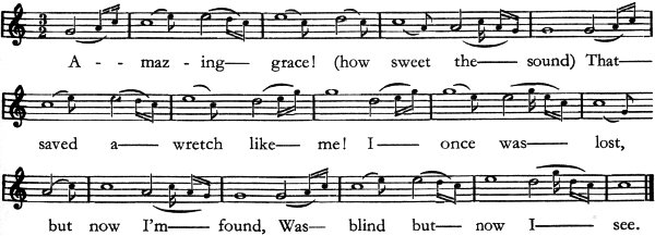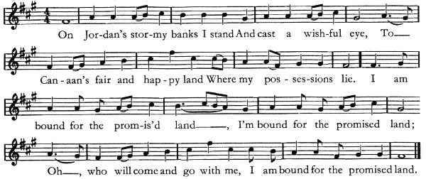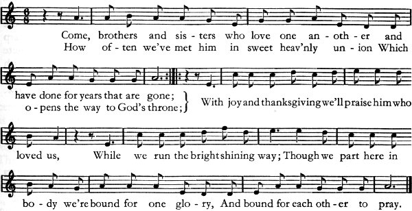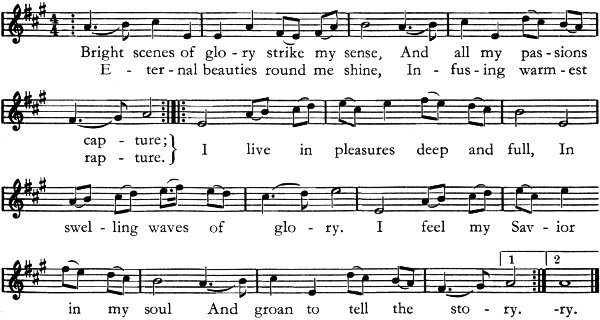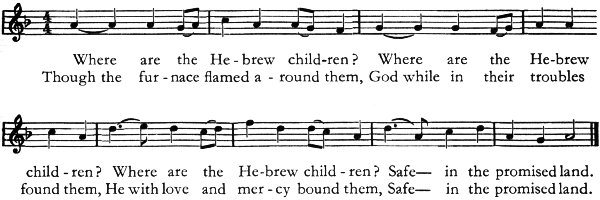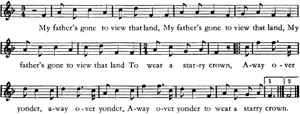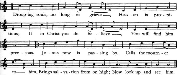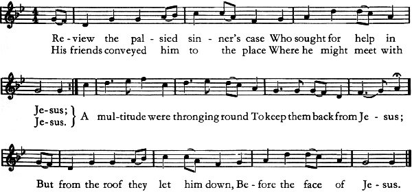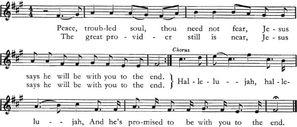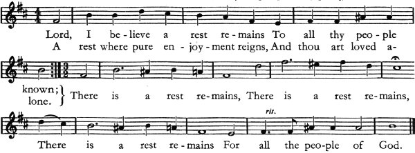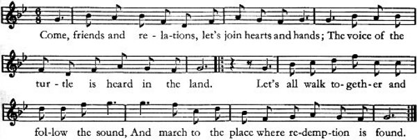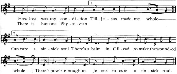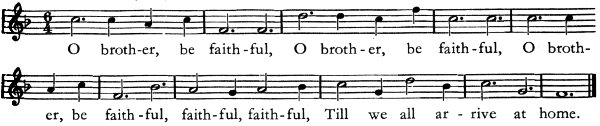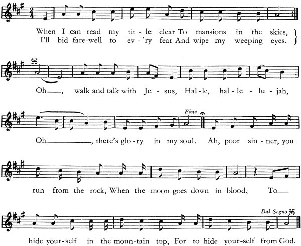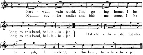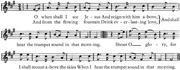 Bearing all this in mind it is perhaps easier to understand how the folk-hymns—grown up in a less boisterous environment—failed to satisfy the new conditions. At the camp meetings it was not a question of inducing every one to sing, but of letting every one sing, of letting them sing songs which were so simple that they became not a hindrance to general participation but an irresistible temptation to join in. The tunes of the folk-hymns were adequate. But the texts (Watts, Wesley and their schools) still demanded a certain exercise of learning and remembering which excluded many from the singing. The corrective lay in the progressive simplification of the texts; and it was in the main this text simplification which brought about and characterised the type of camp-meeting song which was called, in contradistinction to all other types, the spiritual song.