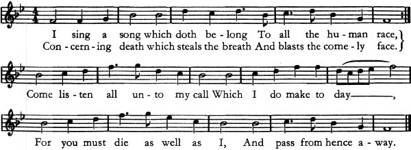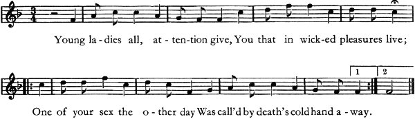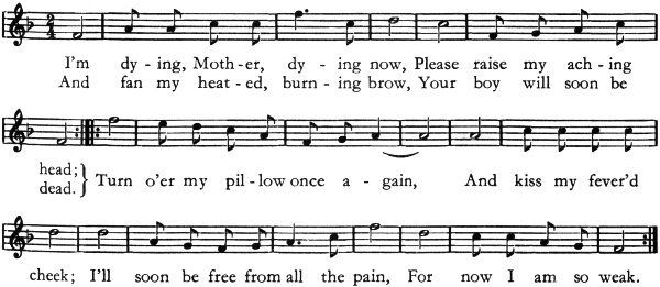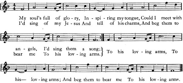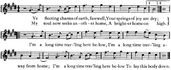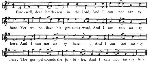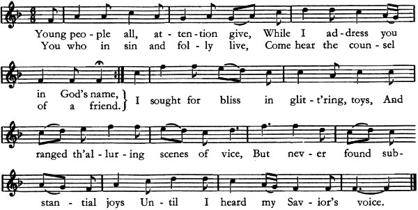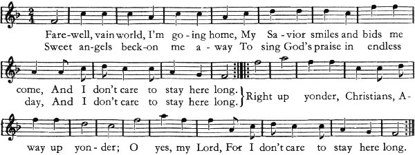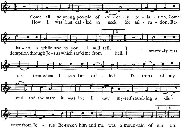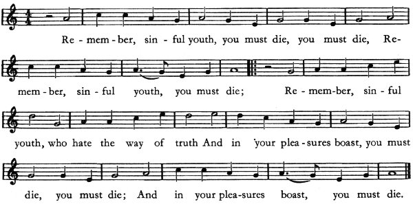 A younger variety of song which I include under the heading of religious ballads is that in which the singer tells his story in the first person. Such stories are those of the poor wayfaring stranger just a-going over Jordan, the departing preacher or missionary, a dying boy or girl, and even a pious gold hunter dying on his way to California. The story may be also the plaint of the religious “mourner”, the backslider, and the criminal sinner, or the exultant tale of the saved. Still another group of ballads is aimed more directly at the conversion of the “young, the gay, and proud.” They usually begin by telling the religious experience of the singer and close with a warning as to the tragic results of worldliness and an exhortation to turn from “this vain world of sin.” These songs are quite similar to the worldly ballads in form, and their tunes are, as will be pointed out presently, of the common folk stock.