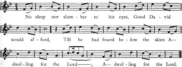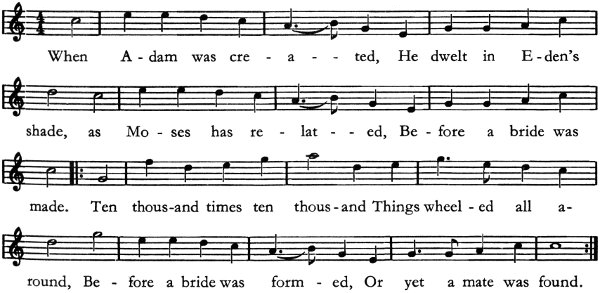 The ancestors of the bearers of the Southern tradition of folk-music began in very ancient times the practice of singing religious songs to folk-tunes. Nor must one think that this custom showed a lack of respect for religion. On the contrary, it rather emphasized the respect and love of the folk for their traditional music. As their most loved and treasured possession, they brought this noble musical heritage and laid it on the altar of their worship. There is a strong probability that this practice has continued unbroken for at least thirteen centuries. William of Malmsbury, writing in the twelfth century, gives an anecdote of St. Aldhelm, the Anglo-Saxon abbot of Malmsbury during the seventh century, which he took from the notebook of King Alfred the Great, which was extant at that time. According to this story, the Saint would station himself on a bridge in the guise of a gleeman and would collect an audience by singing popular songs. He would then gradually insert into his entertainment the words of the holy scriptures and so lead his hearers to salvation. The chronicler also states that one of the popular songs made by St. Aldhelm and mentioned by King Alfred was still being sung by the folk at the time of his writing, almost five hundred years later.
