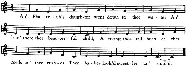 he is not only following a practice of the early spiritual song makers and singers—his horse-shoe song itself is a parody of a spiritual in this collection—but he is singing in the infinitely older manner of his race. He is singing an organically constructed tune and refusing to let words interfere with it, a tendency which may be observed from ‘Sumer is icumen in’ to the nineteenth century songs of sailors and to other work-songs and children’s songs, like that of ‘The Big Bad Wolf’, today.