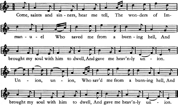The ballads (excepting the experience variety) probably did not originate in any particular organized religious movement. The folk-hymns were, on the other hand, bound up genetically with the protestant evangelical activity which followed John Wesley’s lead in England and then in America. The Wesleyan Revival began as an ordered small-group affair and spread and developed ultimately into a movement whose aspects and practices were completely free-affairs of the uninhibited masses. In the same way the song of that movement, beginning with merely the taste of textual freedom offered by Watts and the Wesleys, and of musical freedom offered by those who furnished the melodies, spread ultimately far beyond the “allowed” tunes and hymn texts of the authorities until religious gatherings were musically completely liberated.