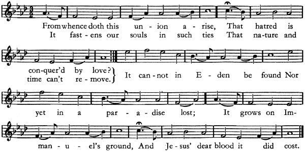 In the sixteenth century, the early Presbyterians continued this usage, as is evidenced by Wedderburn’s hymnal published in Edinburgh in 1560, quaintly entitled: Ane Compendius Booke of Godly and Spirituall Songs, Collected out of Sundrie Parts of the Scriptures, with Sundrie of Other Ballates Changed out of Prophaine Songs, for Avoiding of Sin and Harlotrey. Among these latter was a parody of ‘John, Come Kiss Me,’ the wide and enduring popularity of which is attested by its inclusion in Queen Elizabeth’s Virginal Book, Playford’s Introduction, Apollo’s Banquet for the Treble Violin, Walsh’s Division Violin, Playford’s Division Violin and Pills to Purge Melancholy. There are also references to it in Thomas Heywood’s A Woman Killed with Kindness, Westminster Drollery, Burton’s Anatomy of Melancholy, The Scourge of Folly, Braithwaite’s Shepherd’s Tales, Tom Tiler and his Wife, and Henry Bold’s Songs and Poems. Allan Cunningham quotes the parody in The Songs of Scotland, Ancient and Modern, as follows:
