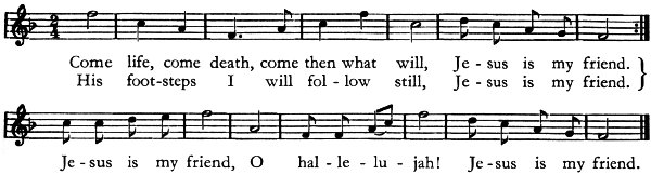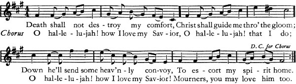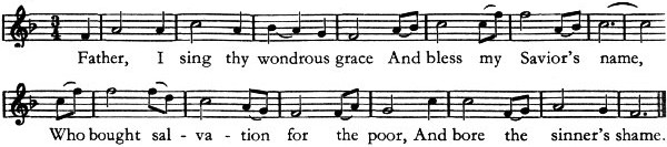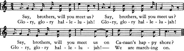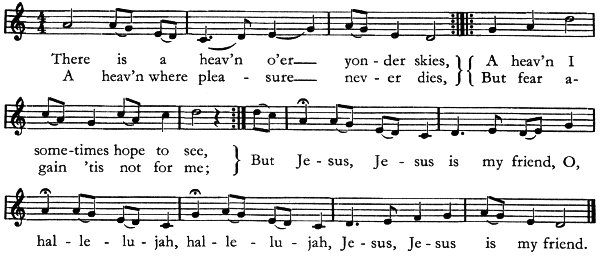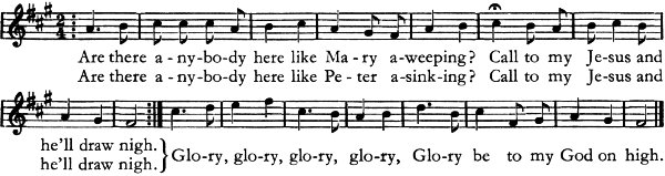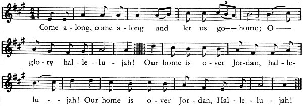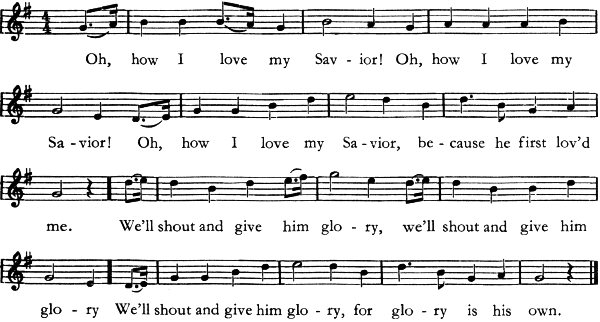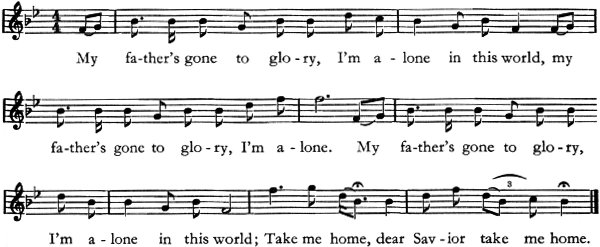 The text simplification in religious folk-songs began modestly. The variety of spiritual song which is closest to the folk-hymn is that in which each short stanza of text (four short lines usually) is followed by a chorus of the same length, as for example: