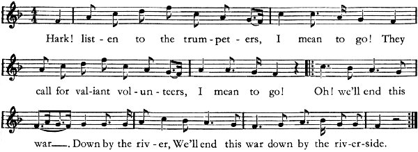 This song is attributed to Henry F. Chandler and dated 1854. ‘The Irish Girl’, as sung in Virginia, shows a similar rhythmic trend but is less closely related tonally. See Sharp, ii., 254. Greater melodic resemblance is seen in ‘Our Goodman’ Sharp, i., 269, tune “D”.