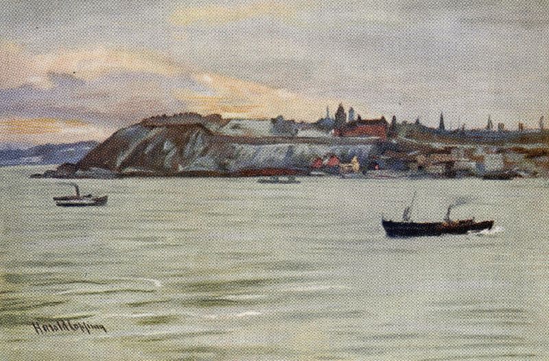There was no moon shining when, nine years ago, a ship that had voyaged for days across the sea, and for hours through the night, brought me suddenly into view of an escarpment aglow with myriad friendly lights. And soon a quaint old Frenchman in a white hat was driving me in a quaint old carriage up quaint, steep streets where lamp-light gave glimpses of walls of naked rock and mellow brickwork, of venerable gabled houses with green shutters, of noble buildings grey with antiquity, and of stately monuments standing amid leafy gardens, with here and there a moss-grown cannon peeping out of its crumbling embrasure. Nor was it long before, in the garden of the Château Frontenac—that huge, handsome hotel—I was stealing nasturtium blooms.