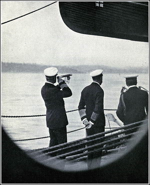 After the dinner on board the Emperor’s yacht, the Standardt, a serenading party of singers came off from the shore in a tug, which was then anchored close to the Royal Yachts. They sang deliciously while the guests were smoking their cigars on deck. Of course it was still broad daylight, so that the Royalties were in easy view of the singers, and at the outside a couple of hundred yards off. This appeared to me to be a very risky proceeding, so I sent for an old friend of mine, (now Sir Patrick Quinn), then, the Special Detective Officer in charge of the King, to ask him his opinion. I pointed out to him that in broad daylight, as it was, any disaffected person on board the tug, if prepared to give up his own life, could make a certainty of shooting any member of the two Royal Families that he liked to select. Quinn’s answer was, “You need not fuss, Captain; there is not a man or a woman on board the tug who has not been stripped by the Russian Police and searched for arms before being embarked, and when it comes to searching, the Russian Police do not make mistakes.”