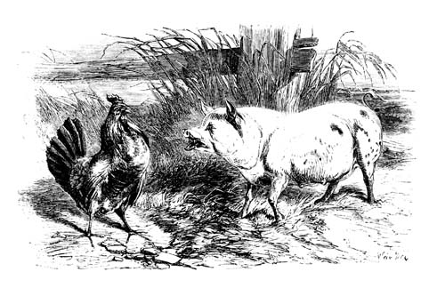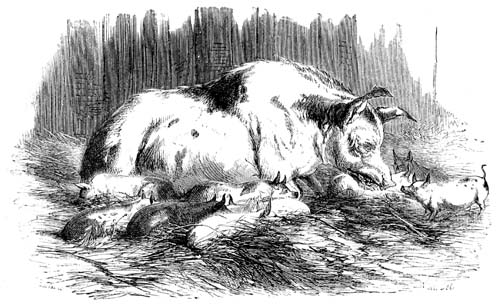 The little pig did not dare answer his mother, so he lay quite still for a minute or two, hoping that he should hear the same noise again. And presently he did hear it, louder than before, and there could be no doubt that more than usual was going on about the premises. He looked round to see what his mother would say now; but she had fallen fast asleep again, and two or three of his brothers were snoring very loud. His little brother Fatsides was lying close to him, and Wilful thought by the twinkling of his eyes that he was not really asleep; so he gave him a kick, and said in a very low voice, for fear his mother should hear him, “Fatsides, Fatsides, do you hear?[8] there is that strange noise come back that I heard before. Do just listen. What can it be?”