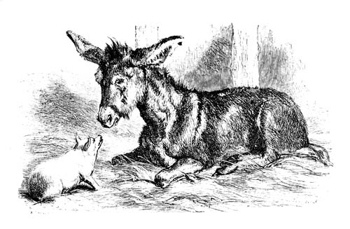 But Fatsides made no answer; he had fallen asleep whilst Wilful was talking, and all the others were snoring away as happily as possible. Wilful saw it was of no use to try to make any of them go out with him into the yard; and to go out he was determined, come what would of it, for he had one of those inquisitive and restless dispositions that cannot be satisfied without prying into everything. He lay quite still, however, for a minute or two, to make sure of his mother’s being asleep; and then rustling carefully through the straw, he pushed hard against[12] the door of the sty, which opened suddenly with such a loud creak as made the old sow give a great grunt, and half open one of her eyes. Wilful himself nearly jumped out of his skin, but recovering himself directly, he set off and ran as fast as he could along one side of the yard, without thinking where he was going, till he was stopped by coming against some great rough thing that lay in his way. The stars were shining brightly up in the sky, and by their light Wilful could just see that it was Jack, the old donkey, who was stretched out on the straw close to the cart-shed, dozing away an hour or two to shorten the night. He opened his eyes when Wilful ran up against him, and asked rather drowsily what was the matter.