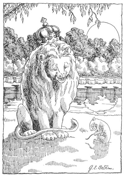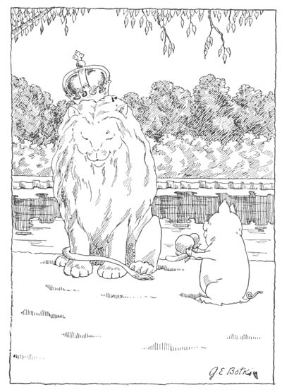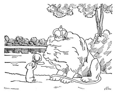 [10]Then he found King Leo on the bank, all ready to receive visitors. He was wearing his crown tipped on the back of his head because he felt happy. He smiled at Robin Rat as pleasant as you please, and asked him to stay to supper.