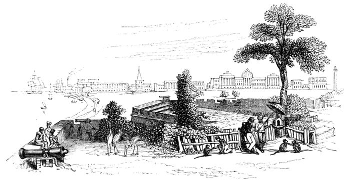The Water Gate of Fort William is now before you, and the horsemen are on the Esplanade,—a road extending by the river side, from Chandpaul Ghāt, to Garden Reach. This is the favourite ride and drive, during the early morning and in the cool of the evening, of all the inhabitants of Calcutta. A dinghī, a native boat covered with matting, is going up the river, filled with gharas, or jars of coarse, red earthenware, used for holding water.