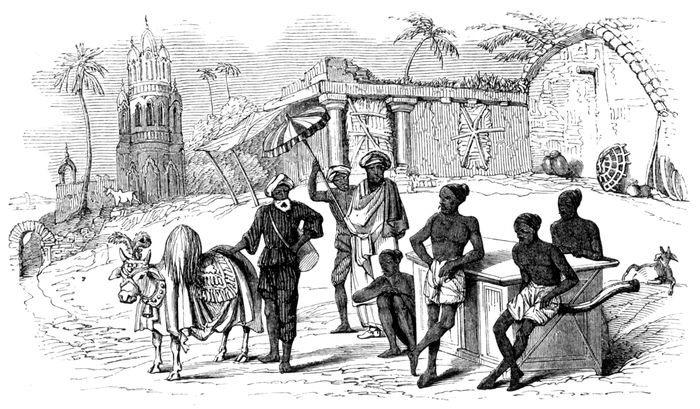 The group in the foreground represents a Bābū, a native gentleman, awaiting the cool of the evening before he enters his palanquin; an attendant is supporting a chatr, or native umbrella, over his head, and the bearers with the palanquin are in attendance.