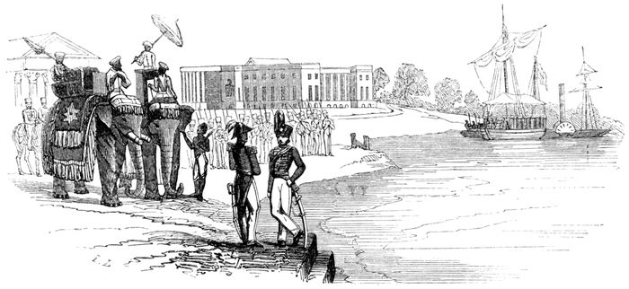 The Governor-General having come up the river in his yacht, the Sona-makhī, towed by a steamer, is represented as quitting the vessel to land at Barrackpore. The troops are drawn out awaiting his arrival; the elephants are ready to convey him to the house; the aid-de-camps are in attendance; and each of their horses is held by a sāīs, or groom, who carries in his hand a chaurī, to keep flies from the animal.