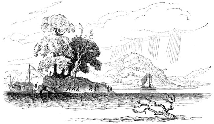 A native has just succeeded in crossing the river on a bundle of reeds; his clothes placed on the top of his head are safe from wet, and with one hand he paddles along. On the outskirts of the village is seen a remarkably ancient Banyan-tree, the Ficus Indica.