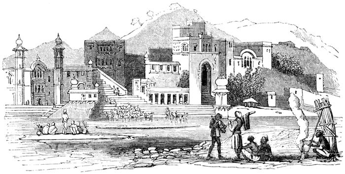 A fair takes place annually at Hurdwar, in the month of April, lasting nearly a fortnight; that being the period chosen by pilgrims, who flock from all parts of India to perform their ablutions in the Ganges: it is held in the bed of the river, which at that period is nearly dry. Two or three hundred thousand people are attracted to this fair, and every twelfth year, it is supposed a million of people assemble at this place. The scene is interesting in the highest degree. Merchants from Calcutta meet with others from Osbeck Tartary, and Cabul; and thousands of Seiks attend the fair. Horse merchants from Bokhara and Cabul occupy the central parts of the dry bed of the river; those from Tūrkistān encamp at the back of the town. Elephant dealers traverse the roads of the fair with their animals, morning and evening; and the place is crowded with camels, mules, and shawl and jewel merchants; in fact, merchandise of every description is collected at the fair from every part of the Eastern world, and it is difficult to convey even a faint idea of the swarms of living creatures, men and beasts of every description, which occupy every foot of ground during the fair.