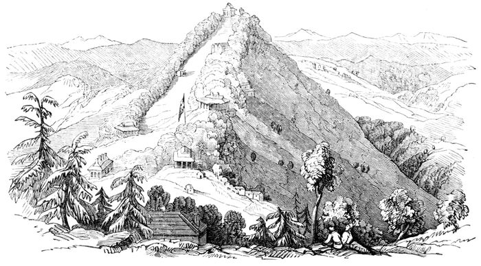 As the chosen retreat of Governors-General and Commanders-in-Chief, from the burning plains of India, the place has enjoyed for some years past many considerable advantages. A great number of residences have been built on the hills; the roads are good; there is a church, a school, an observatory, an amateur theatre, &c. You have a glimpse of the snowy ranges in the distance. The conical hill is crowned by Stirling Castle; and the house 66below it was then inhabited by Colonel Birch, the Judge Advocate General. The flag-staff points out the residence of his Excellency the Commander-in-Chief, and the houses below, on the left, are those occupied by the Aid-de-camps. Two hill men are in the foreground, with the baskets in which they carry provisions on their backs.