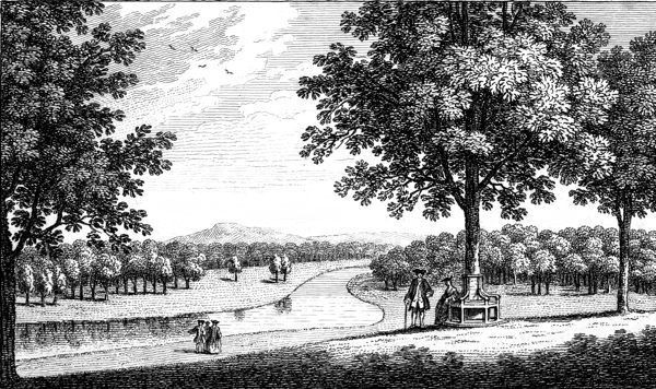 Moor Park, near Rickmansworth in Hertfordshire, is at present the seat of Lord Anson. The park is not large, but is very beautiful, whether we consider it 12within itself or with regard to the fine and extensive prospects from it. The house was originally built by Cardinal Wolsey, and, passing through many hands, was afterwards in possession of the Duke of Monmouth. Then it came into the hands of Mr. Stiles, who enlarged, repaired, and beautified it, under the direction of Sir James Thornhill. It stands on a hill, not quite on the summit. It is of stone of the Corinthian order; and, if not in the highest stile of architecture, is yet very noble. The south, or principal front, has a portico and pediment of four columns. The offices are joined to the house by a beautiful circular colonade of the Ionic order, which terminates very elegantly with domes on each side their entrance. One cannot help wishing the house on the top of the hill, or that part of the hill were removed, for you can’t now see the principal front till you are upon it. Even in the view given in the print, part of one of the wings is hid by the rising ground.