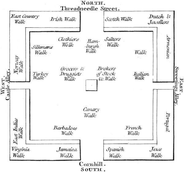 Moorfields being a very extensive piece of ground, is now divided into Lower Moorfields, Middle Moorfields, and Upper Moorfields. The first of these divisions 10has the hospital of Bethlem, a noble building, extending along the whole south side: and here the fields are divided into four different squares, by very strong, but clumsey, wooden rails, each containing a large grass plat, surrounded on each side by a row of trees. Between these squares, which are generally denominated the quarters, are gravel walks; and one extending from east to west, with a row of trees on each side, forming a tolerable vista, is usually denominated the City Mall; a great concourse of well-dressed citizens of both sexes walking there, particularly every Sunday noon in fine weather, and on evenings.