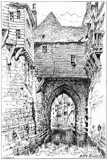 In the first number of these papers we pointed out the fact that the cottages and small houses in fortified villages exhibited a totally different character from those in open and unwalled villages. Owing to the space being confined within the walls, any increase in the number of inhabitants had either to be provided with accommodation by adding to the height of the existing habitations or by setting up dwelling-houses in out-of-the-way places. Our sketch of Lyme Regis shows the outlet of a river which here flows into the sea; the fortified walls are continued along the banks; the principal street of the village is carried over the river by a bridge consisting of a lofty and elegantly proportioned Gothic arch, evidently of thirteenth century date. Cottages or small habitations cling to the walls supported upon wooden corbels, and are bracketed out from the parapets of the bridge, giving the latter more the effect of a gateway than of a bridge. The whole scene is strange though very picturesque, and those who are accustomed to the ordinary English village, with its detached cottages, surrounded by gardens, are naturally surprised at the singular effect brought about by such changed conditions. Those, however, who know the fortified villages of Germany, France, and the Low Countries, are quite familiar with such scenes, and regard them as usual in villages prepared for war, as contrasted with the ordinary villages of our country where peace was the normal condition.