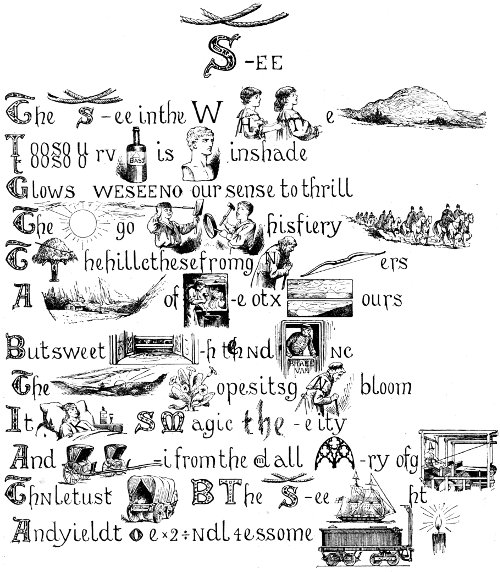 Again, our critic complains of the absence of commas in line 4, which should, in his opinion, read—“And on it, here and there, a tree.” Here we prefer the amended version to that printed, but it is entirely a question of taste and not of accuracy. He further asserts that the note of exclamation can correctly follow either the interjection or “happiness” in line 10. So it can, and our only crime is that we did not print it in both places. Finally he complains that while his solution was not mentioned, some solutions which owed their perfection to his help were more fortunate. The information is no surprise to us, for we have often traced our correspondent’s hand in solutions under another name. He says—“I suppose this is allowable.” It is allowable inasmuch as we have no rule forbidding it, but we do not think that help ought to be asked from a rival competitor. It does not accord with our notions of strict fairness, and a less generously-minded solver would not place his ingenuity at the disposal of his friends.