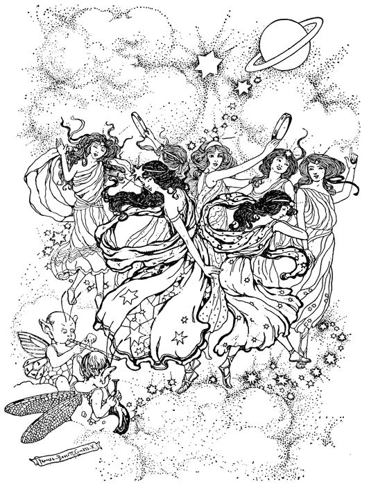 The Kitten didn’t come close until she was ready, and then she immediately cuddled up, sleepy; but the Others went straight to the Princess. She put her arm around them and they leaned against her, but they didn’t talk, they watched with her. And more stars came out where they looked steadily, and others came where they didn’t look, more than they could count, all silent, to look back at them. And the Princess was smiling to herself.—