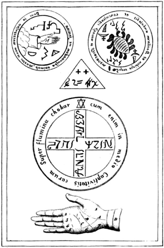 | Le quattro figure geometriche che sono in alto rappresentano: le due circolari superiori i talismani, la circolare inferiore più grande un pentacolo: il triangolo è quello che si disegnava in mezzo al circolo magico. | ||