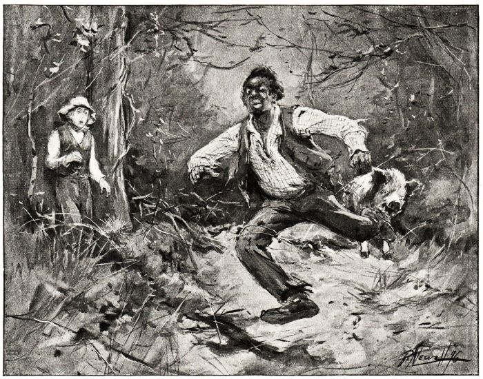 Suddenly he heard a scream that almost paralyzed him—a scream that was followed by the sound of a struggle going on in the thick undergrowth close at hand. He could see the muddy water splash above the bushes, and he could hear fierce growlings and gruntings. Before he could make up his mind what to do, a gigantic mulatto, with torn clothes and staring eyes, rushed out of the swamp, and came rushing by, closely pursued by a big white boar, with[Pg 156] open mouth and fierce cries. The white boar was right at the mulatto's heels, and his yellow tusks gleamed viciously as he ran with open mouth. Pursuer and pursued disappeared in the bushes with a splash and a crash, and then all was as still as before. In fact, the silence seemed profounder for this uncanny and appalling disturbance. It was so unnatural that half a minute after it occurred Ben Gadsby was not certain whether it had occurred at all. He was a pretty bold youth, having been used to the woods and fields all his life, but he had now beheld a spectacle so out of the ordinary, and of so startling a character, that he made haste to get out of the swamp as fast as his legs, weakened by fear, would carry him.