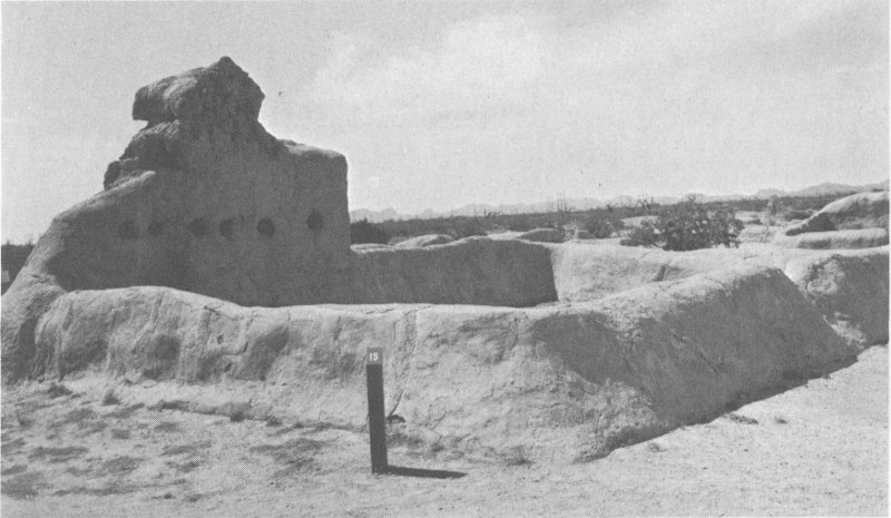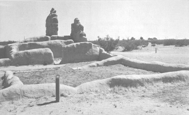 The wall around this village originally stood 7 to 11 feet high. There were no doorways in it. This wall and building of this village are of caliche, a limy subsoil found 2 to 5 feet below the surface of this region. To get in or out of the village the Indians used ladders to climb over the wall. The foundations, all that remain of the wall, are covered with wire reinforced, tinted-cement stucco to protect them. Stepping or sitting on the walls may damage them. Help us to protect the walls.