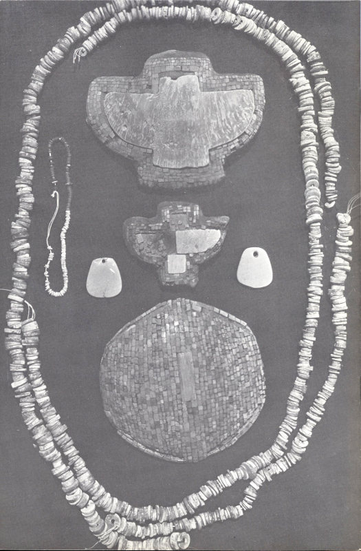 The turquoise and shell mosaic emblems in the Visitor Center jewelry exhibit were found in 1926 in the west end of this room during excavations to stabilize the walls. They are exceptionally fine examples of prehistoric mosaic handicraft. (See photo on back cover).