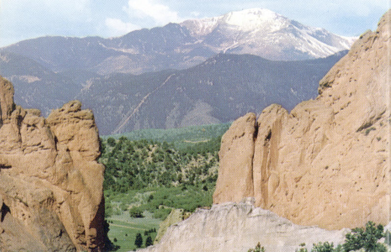 Pikes Peak rises to an elevation at 14,110 feet. Composed of Pikes Peak Granite, the mountain is almost surrounded by younger sedimentary rocks, including those of the Garden of the Gods, in the foreground. (Floyd Walters photo)