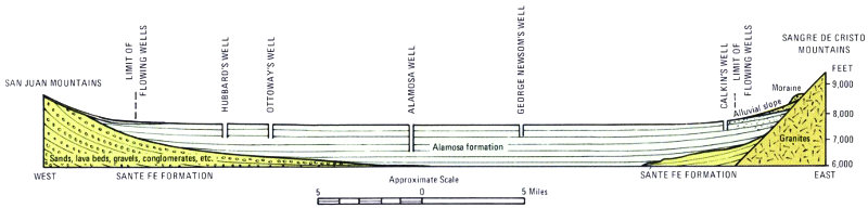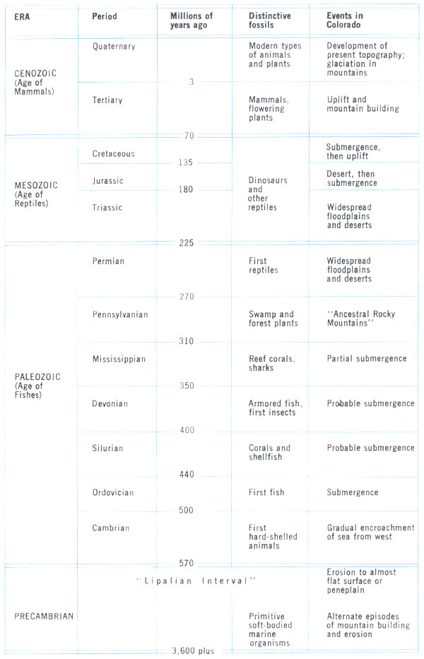 The stratigraphic column shown opposite may be thought of as a calendar by which geologic events in Colorado can be arranged in their proper order and related to events in the rest of the world. Mississippian and Pennsylvanian Periods are American divisions; elsewhere this time interval is known as the Carboniferous Period. Other time terms are in worldwide use.