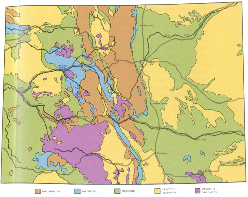 In the generalized geologic map of Colorado which accompanies Chapter II, rocks are identified by the era in which they were formed. A more detailed geologic map can be obtained from the U.S. Geologic Survey map distribution center in the Federal Building, Denver.