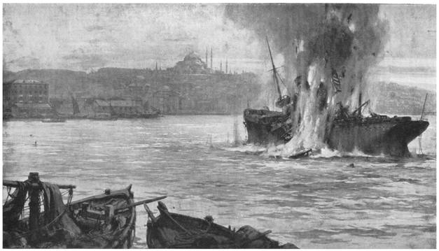 THE GREAT EXPLOIT OF E. 11: TORPEDOING AN ENEMY VESSEL OFF CONSTANTINOPLE.