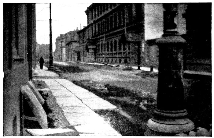 The roads along which these tramcars run are in a frightful condition. They have not been repaired for three or four years; they 22are full of holes like shell-holes, often two or three feet deep. Frost has eaten out great cavities, drains have collapsed, and people have torn up the wood pavement for fires. Only once did we see any attempt to repair the streets in Petrograd. In a side street some mysterious agency had collected a load of wood blocks and two barrels of tar. Most of our longer journeys about the town were done in official motor-cars—left over from the former times. A drive is an affair of tremendous swerves and concussions. These surviving motor-cars are running now on kerosene. They disengage clouds of pale blue smoke, and start up with a noise like a machine-gun battle. Every wooden house was demolished for firing last winter, and such masonry as there was in those houses remains in ruinous gaps, between the houses of stone.