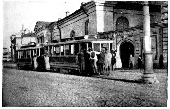 All the great bazaar-like markets are closed, too, in Petersburg now, in the desperate struggle to keep a public control of necessities and prevent the profiteer driving up the last vestiges of food to incredible prices. And this cessation of shops makes walking about the streets seem a silly sort of thing to do. Nobody “walks about” any more. One realises that a modern city is really nothing but long alleys of shops and restaurants and the like. Shut them up, and the meaning of a street has disappeared. 21People hurry past—a thin traffic compared with my memories of 1914. The electric street cars are still running and busy—until six o’clock. They are the only means of locomotion for ordinary people remaining in town—the last legacy of capitalist enterprise. They became free while we were in Petersburg. Previously there had been a charge of two or three roubles—the hundredth part of the price of an egg. Freeing them made little difference in their extreme congestion during the home-going hours. Every one scrambles on the tramcar. If there is no room inside you cluster outside. In the busy hours festoons of people hang outside by any handhold; people are frequently pushed off, and accidents are frequent. We saw a crowd collected round a child cut in half by a tramcar, and two people in the little circle in which we moved in Petersburg had broken their legs in tramway accidents.