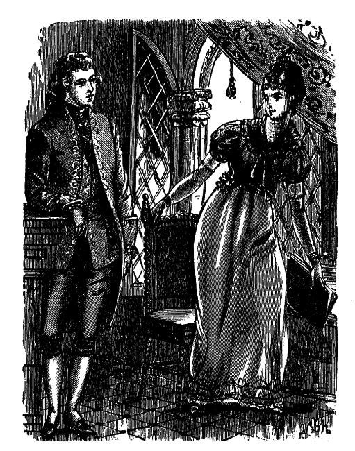 “I wish, my lord,” cried Oscar, as they were driving round the wood, “you would permit me to stop and view the Hall, and also accompany me to it.” Lord Cherbury looked a little embarrassed. He felt a strong reluctance to visit it, when no longer his, yet he could not think of refusing the earl. Amanda knew his feelings, and wished her brother had not made such[Pg 567] a request. No opposition, however, being shown to it, they stopped at the great gate which opened into the avenue, and alighted. This was a long, beautiful walk, cut through the wood, and in a direct line with the house. On either side were little grassy banks, now covered with a profusion of gay flowers, and a thick row of trees, which, waving their old fantastic branches on high, formed a most delightful shade. Honey-suckles twined around many of the trunks, forming in some places luxuriant canopies, and with a variety of aromatic shrubs quite perfumed the air. It was yet an early hour; the dew, therefore, still sparkled upon the grass, and everything looked in the highest verdure. Through vistas in the wood, a fine clear river was seen, along whose sides beautiful green slopes were stretched, scattered over with flocks, that spread their swelling treasures to the sun. The birds sung sweetly in the embowering recesses of the woods, and so calm, so lovely did the place appear, that Lord Cherbury could not refrain a sigh for its loss. “How delighted,” cried he, casting his fine eyes around, “should I have been still to have cherished those old trees, beneath whose shades some of my happiest hours were passed.” They entered the hall, whose folding door they found open. It was large and gothic; a row of arched windows were on either side, whose recesses were filled with myrtles, roses, and geraniums, which emitted a delicious perfume, and, contrasted with the white walls, gave an appearance of the greatest gayety to the place.