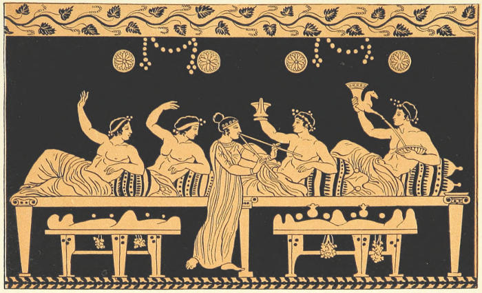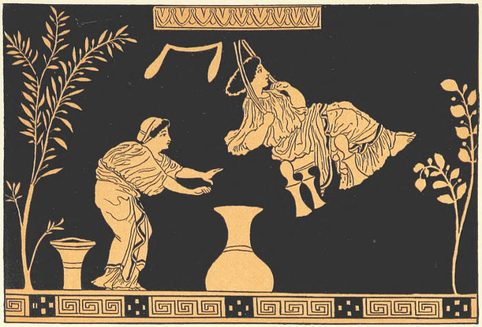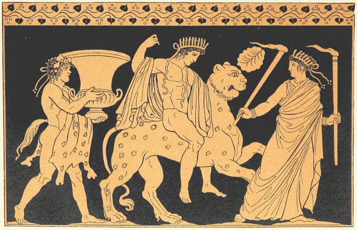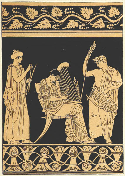 [35] The Peplos was the sacred robe destined to adorn the statue of the goddess. It was carried, spread like a sail on a mast, much after the fashion of the banners used in processions now-a-days. It was embroidered with figures, the Battle of the Giants, in which Athené was represented as playing an important part, being one of the chief subjects. The Basket-bearers were maidens who carried baskets on their heads containing various sacred things used in the worship. It was necessary that they should be of unmixed Athenian descent, and the office was considered a great honour. Their hair was powdered; they carried strings of figs in their hands, and parasols were held over their heads.
