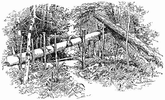 Dat was het eerste van wel twaalf zulke paden die ik sindsdien aantrof en die de bochten van rivieren in de wildernis doorsneden,—de manier die ’t boschvolkje er op nahoudt om op reis tijd uit te sparen. Ik [33]liet Simmo verder gaan, de rivier af, terwijl ik het verscholen paadje nieuwsgierig volgde. Er is niets zoo verleidelijk in de bosschen, als het wilde goedje na te prenten en te zien wat ze uitgevoerd hebben.