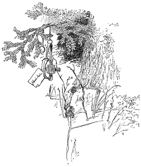Laat op dien middag stootte ik op zijn spoor en aangezien ’k niets belangrijkers te doen had, ging ik het volgen. Het leidde regelrecht naar het doornboschje waar de oude beukenpatrijs op stok ging. Ik had er dikwijls tevergeefs naar gezocht, eer de vos mij er bracht; maar Jantje had op een van zijn zwerftochten prenten en een paar veeren onder een cedertak gevonden en wist best wat dat zeggen wilde. Daar was zijn klem, precies op de plek, waar de oude patrijs den vorigen avond gestaan had, toen hij zijn sprong nam naar den ondersten tak. Er was volop koren uitgestrooid en een blauwe gaai, die Jan achterna gegaan was, zat al stevig in de klem; bij den wortel van zijn snavel net onder de oogen was hij gegrepen. Hij had de klem doen toeklappen, toen hij naar wat koren pikte, dat listig met een dun ijzerdraadje aan de pan was vastgemaakt. [105]Toen ik de gaai zorgvuldig uit de klem nam, hield zij zich dood en slap in mijn hand, tot mijn greep ontspande en zij naar een tak boven mijn hoofd vloog, waar zij me bekeef en uitschold, omdat ik me inliet met zulke afschuwelijke uitvindingen.