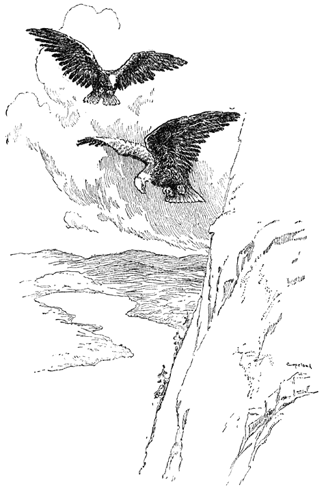 Eens, toen ik bij het boschje kwam op de klip, waar ik gewoonlijk het nest door mijn kijker lag op te nemen, merkte ik, dat er een adelaarsjong weg was. Het andere stond op den rand van het nest angstig naar beneden in den afgrond te kijken, waar zijn dapperder kameraadje zeker heen was gevlogen, en van tijd tot tijd troosteloos te roepen. Zijn heele houding gaf duidelijk te kennen, dat hij honger had en boos en verlaten was. Weldra kwam de moeder-adelaar snel uit het dal met voedsel in haar klauwen. Ze kwam tot den rand van het nest, zweefde er even boven, als om het hongerige adelaarsjong het voedsel [125]te laten zien en ruiken, daalde toen langzaam naar het dal, terwijl ze ’t voedsel meenam en het jong op haar manier aanmaande te komen; dan zou hij het hebben. Hij riep haar hard na van den rand van het nest en breidde herhaaldelijk zijn vleugels uit om haar te volgen. Maar dat neerduiken was te griezelig; zijn moed begaf hem; en hij trok zich veilig weer in het nest terug, trok zijn kop in de schouders, sloot zijn oogen en trachtte te vergeten dat hij honger had. De beteekenis van dit tooneeltje was duidelijk genoeg. Ze poogde hem te leeren vliegen, door hem te verstaan te geven, dat zijn vleugels volwassen waren en dat de tijd gekomen was om ze te gebruiken; maar hij was bang.