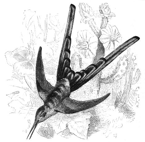 HUMMING BIRDS. The HUMMING BIRDS (Stridor). The GIANT GNOMES (Eustephanus):—The Giant Humming Bird—The Sword-bill Humming Bird. The GNOMES (Polytmus):—The Saw-bill—The Sickle-billed Humming Bird. The SUN BIRDS (Phäetornis):—The Cayenne Hermit. The MOUNTAIN NYMPHS (Oreotrochilus):—The Chimborazian Hill-star. The SABRE-WINGS (Campylopterus):—De Lattrei's Sabre-wing. The TRUE SABRE-WINGS (Platystylopterus):—The Fawn-coloured Sabre-wing. The JEWEL HUMMING BIRDS (Hypophania):—The Crimson Topaz Humming Bird—The Black-capped Humming Bird. The WOOD NYMPHS (Lampornis):—The Mango Humming Bird—The Ruby and Topaz Wood Nymph. The FLOWER NYMPHS (Florisugus):—The Brazilian Fairy. The FLOWER SUCKERS (Florisuga):—The Pied Jacobin. THE FAIRIES (Trochilus):—The Ruby-throated Fairy Humming Bird. The AMETHYST HUMMING BIRDS (Calliphlox):—The Amethyst Humming Bird. The WOODSTARS[iv] (Calothorax, or Lucifer):—Mulsant's Wood-star. The ELVES (Lophornithes). The PLOVER-CRESTS (Cephalolepis):—De Laland's Plover-crest. The COQUETTES (Lophornis):—The Splendid Coquette. The AMAZONS (Bellatrix):—The Royal Amazon. The SUN GEMS (Heliactinus):—The Horned Sun Gem. The SYLPHS (Lesbiæ). The RACKET-TAILED SYLPHS (Steganurus):—The White-footed Racket-tail. The COMETS (Sparganura):—The Sappho Comet. The MASKED HUMMING BIRDS (Microrhamphi):—The Sharp-bearded Masked Humming Bird—The Columbian Thornbill. The HELMET CRESTS (Oxypogon):—Linden's Helmet Crest 45–75
