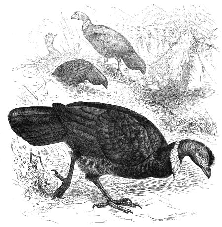 THE TUFTED GUINEA FOWLS (Guttera):—Pucheran's Tufted Guinea Fowl. The GUINEA FOWLS (Numida):—The Common Guinea Fowl—The Mitred Pintado—The Tuft-beaked Pintado. The TURKEYS (Meleagrides):—The Puter, or Wild Turkey. The AUSTRALIAN JUNGLE FOWLS (Megapodinæ). The TALLEGALLI (Tallegalli). The BRUSH TURKEYS (Catheturus):—The Brush Turkey, or Wattled Tallegallus—The Maleo—The Ocellated Leipoa. The MEGAPODES (Megapodii):—The Australian Megapode 256–275